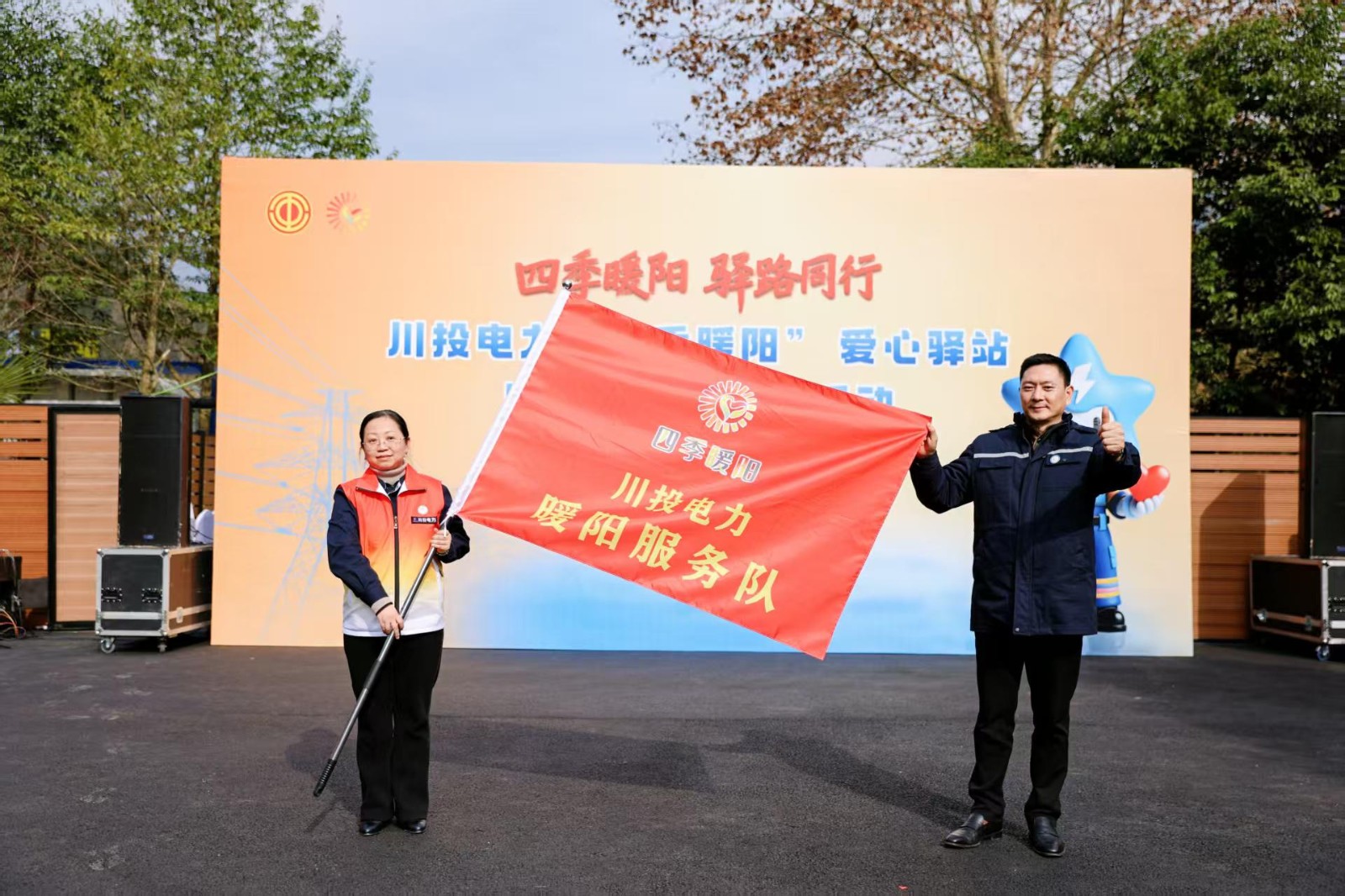 启用活动在激昂的大鼓舞中拉开序幕,铿锵鼓声既奏响新年奋进之音,也传递出国企服务民生的温暖担当。活动现场,冉兰平为川投电力“四季暖阳”爱心驿站(天彭电力凤鸣湖站)授牌,并与杨涛分别为川投电力“暖阳”服务总队和所属公司、电厂“暖阳”服务分队授旗。天彭电力沙金车间爱心驿站服务队员代表现场表态,将以驿站为阵地,立足能源保供主责主业,当好服务群众的“贴心人”,让“四季暖阳”的温度持续传递、惠及更广。